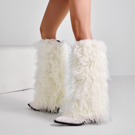 Yilu_High-quality pointed-toe thick-soled long boots with fluffy trim, white, large size, spring/autumn knee-length boots, thick long boots for women