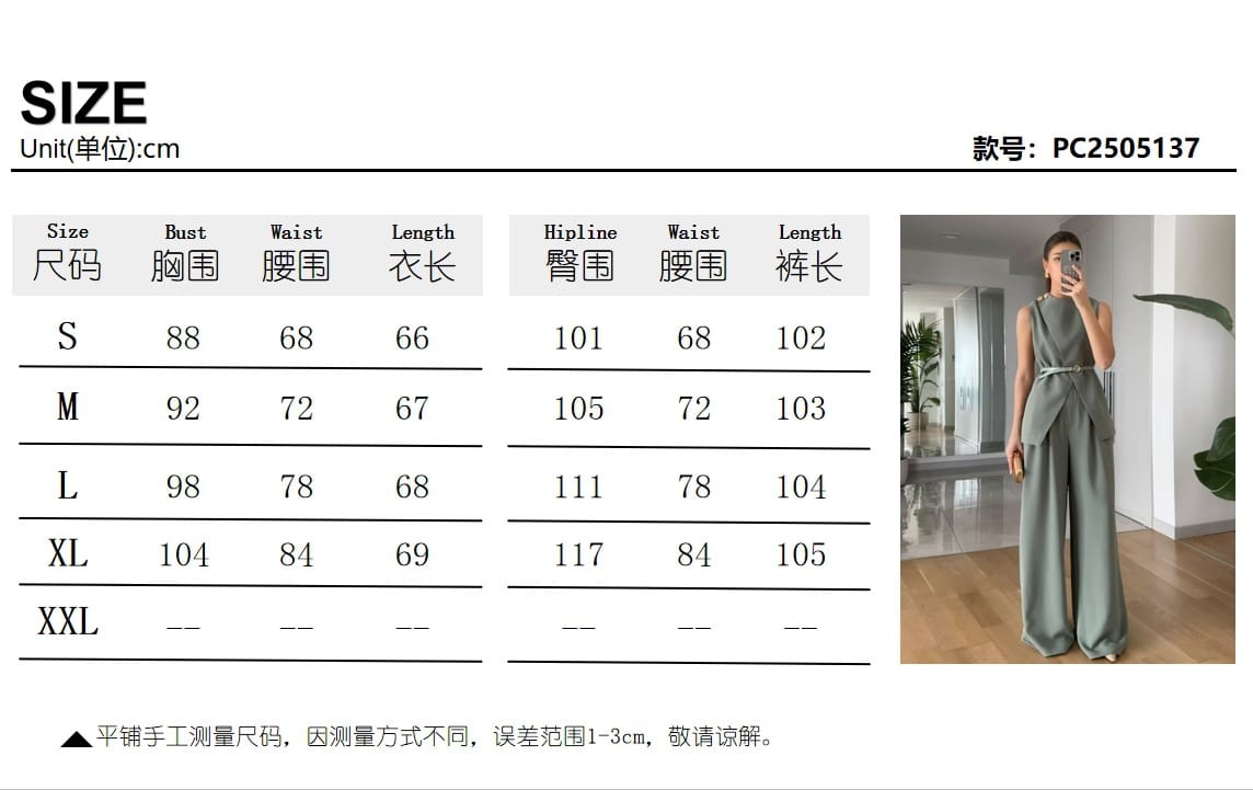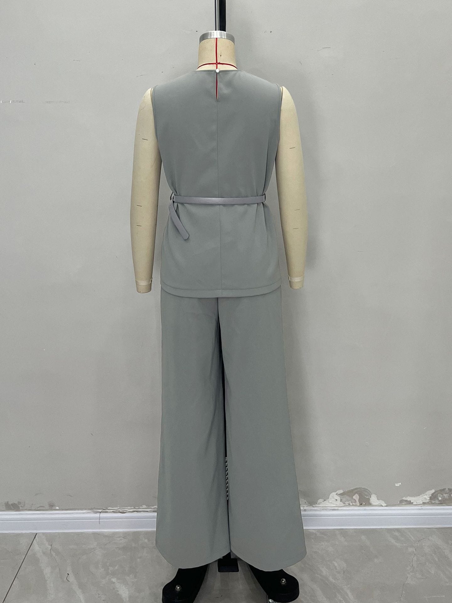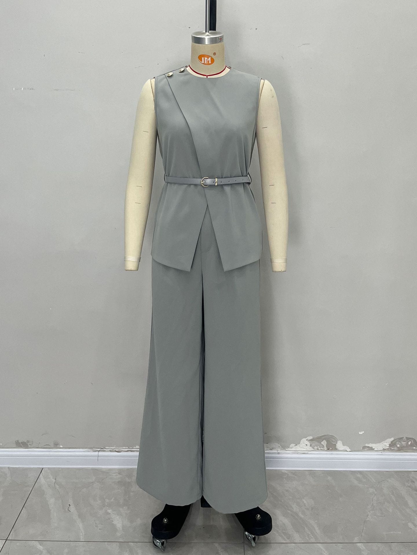 Yilu_High-quality solid-color round-neck sleeveless top and high-waisted wide-leg pants – a two-piece set for workwear for women