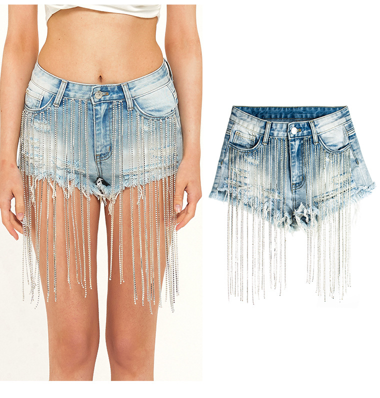 Yilu_High-quality bar dancing lady fashion wear, short summer new style wide-leg pants with high-waist design, long tassels decoration and shiny chains, women’s denim shorts