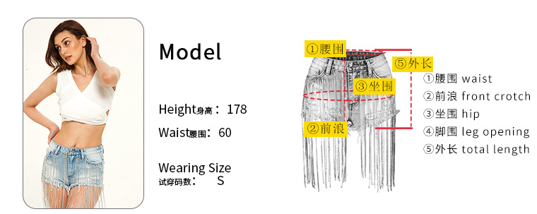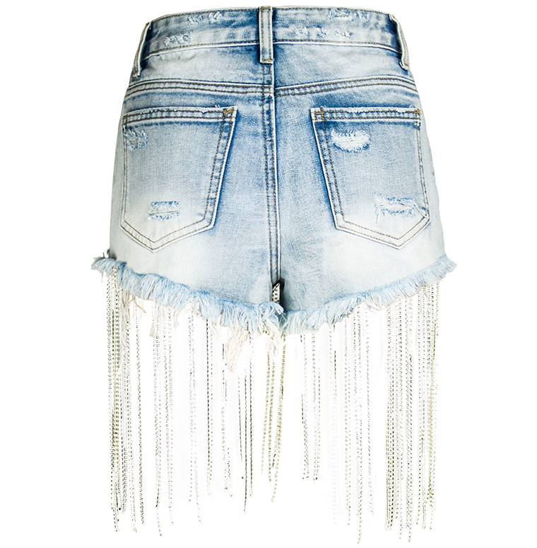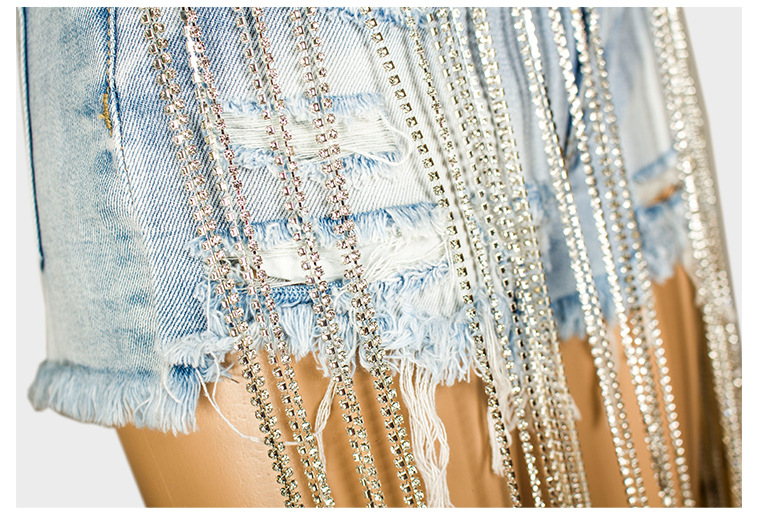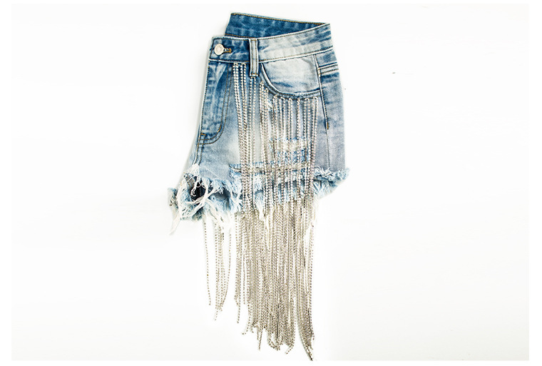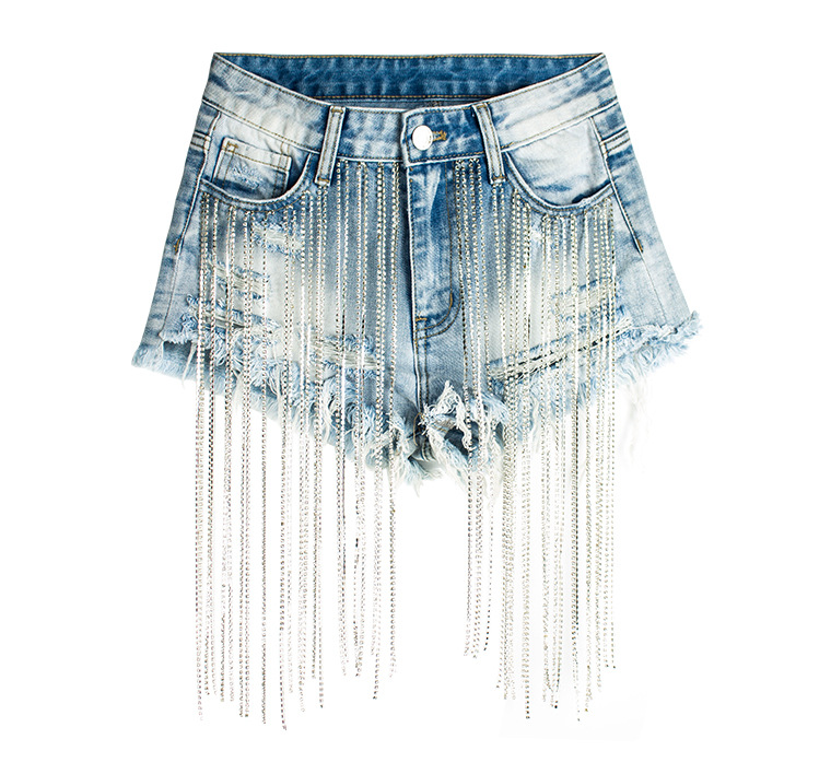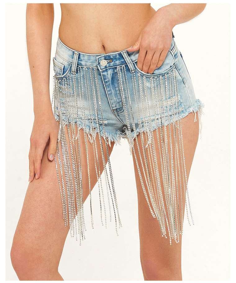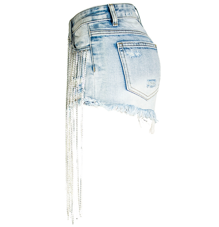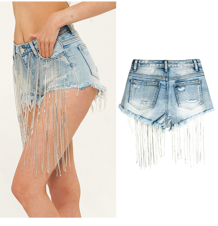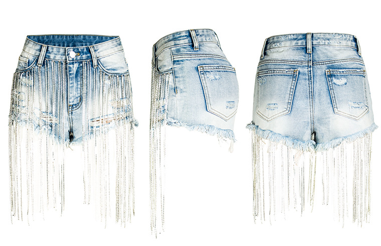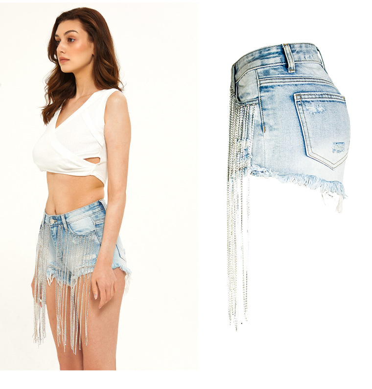 Yilu_High-quality bar dancing lady fashion wear, short summer new style wide-leg pants with high-waist design, long tassels decoration and shiny chains, women’s denim shorts