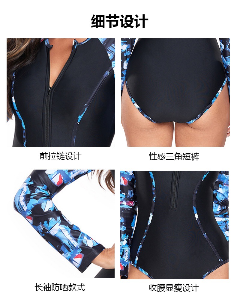 High-quality printed, conservative, slimming and sun-protective zippered surfwear women's one-piece swimsuit