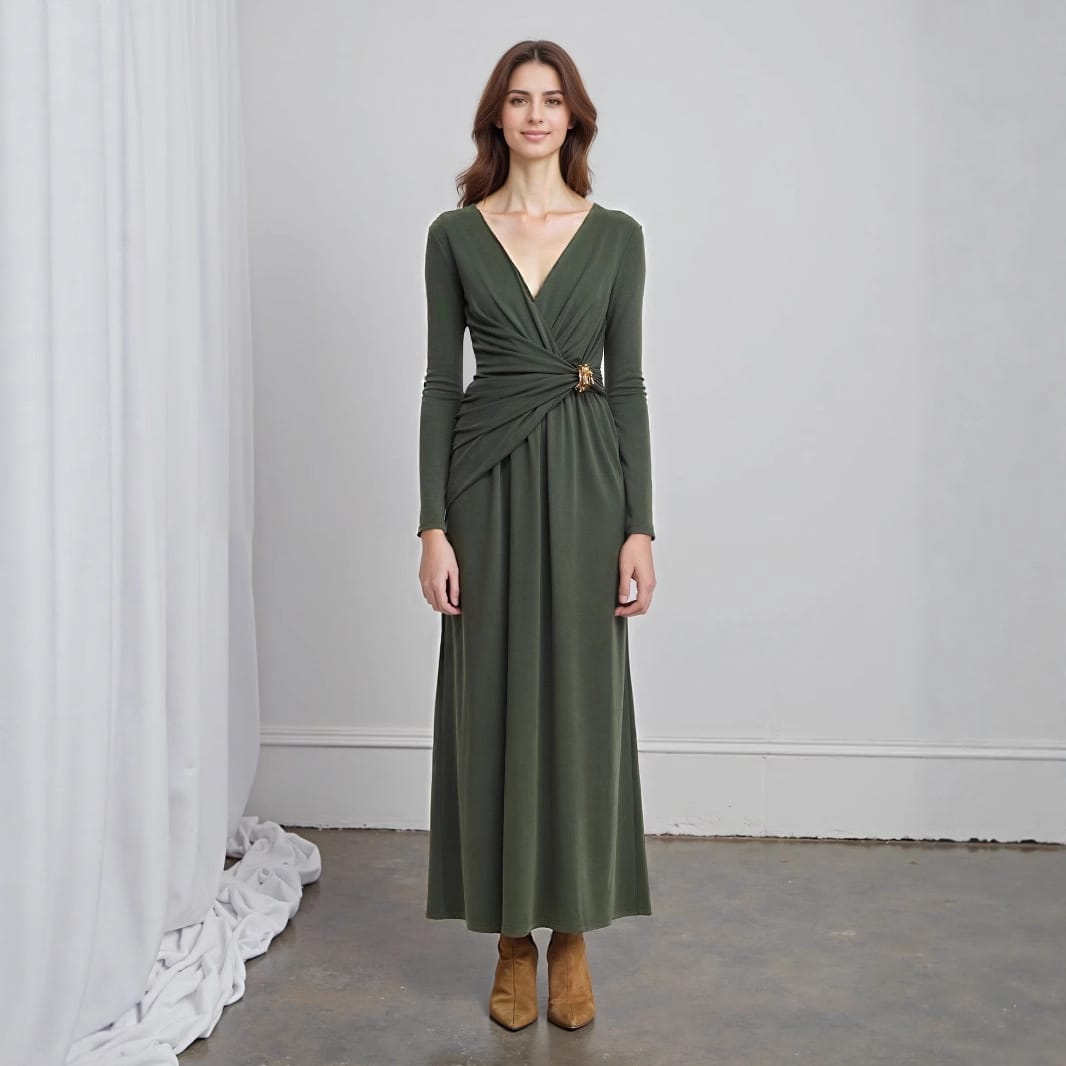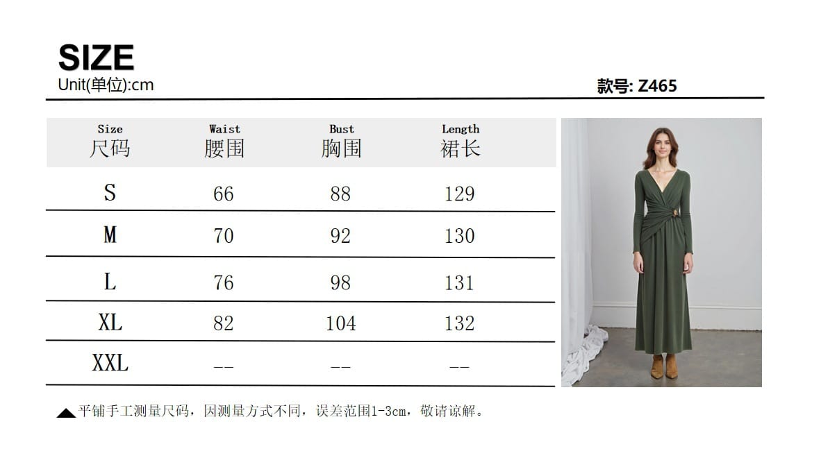 Yilu_High-quality elegant deep V-neck long-sleeved dress with cross pleats at the waist for a cinched look and decorated with metal buttons.