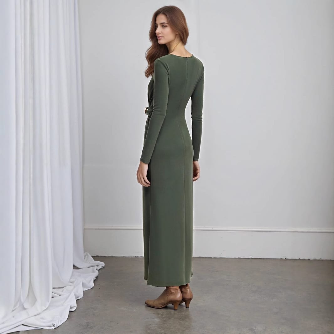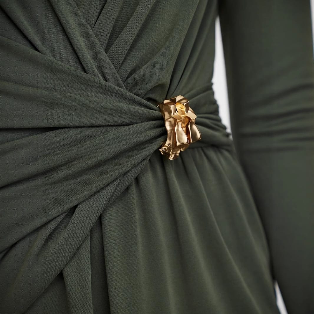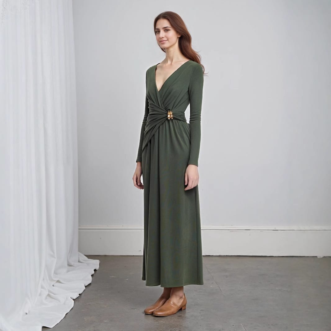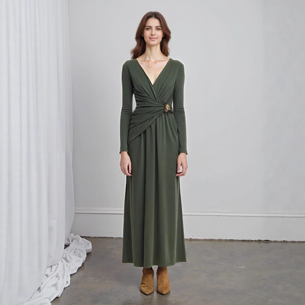 Yilu_High-quality elegant deep V-neck long-sleeved dress with cross pleats at the waist for a cinched look and decorated with metal buttons.