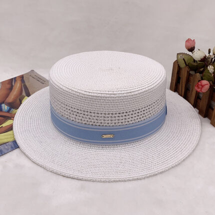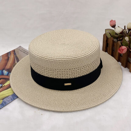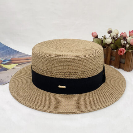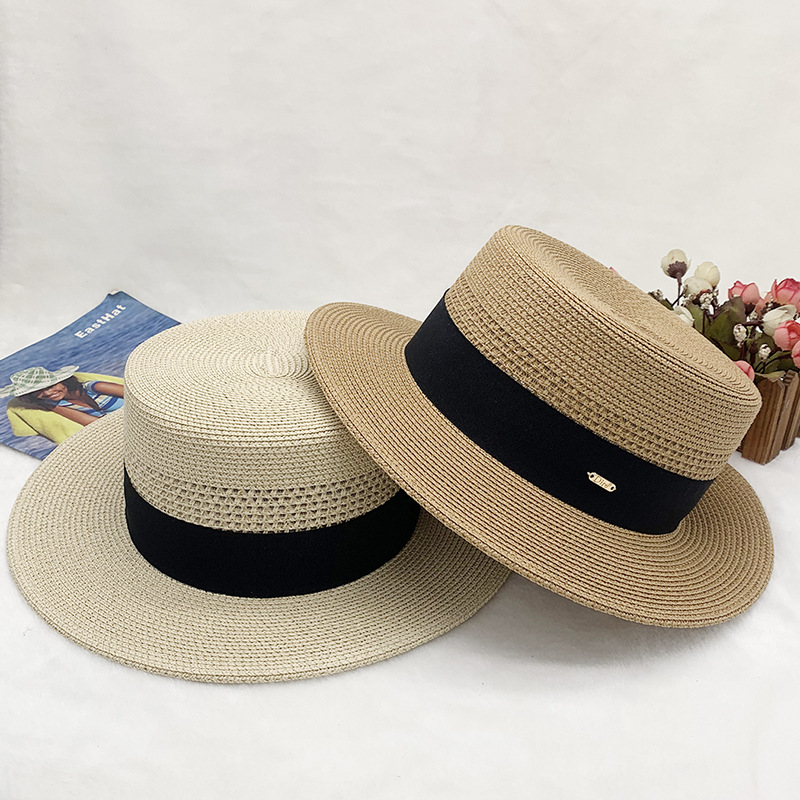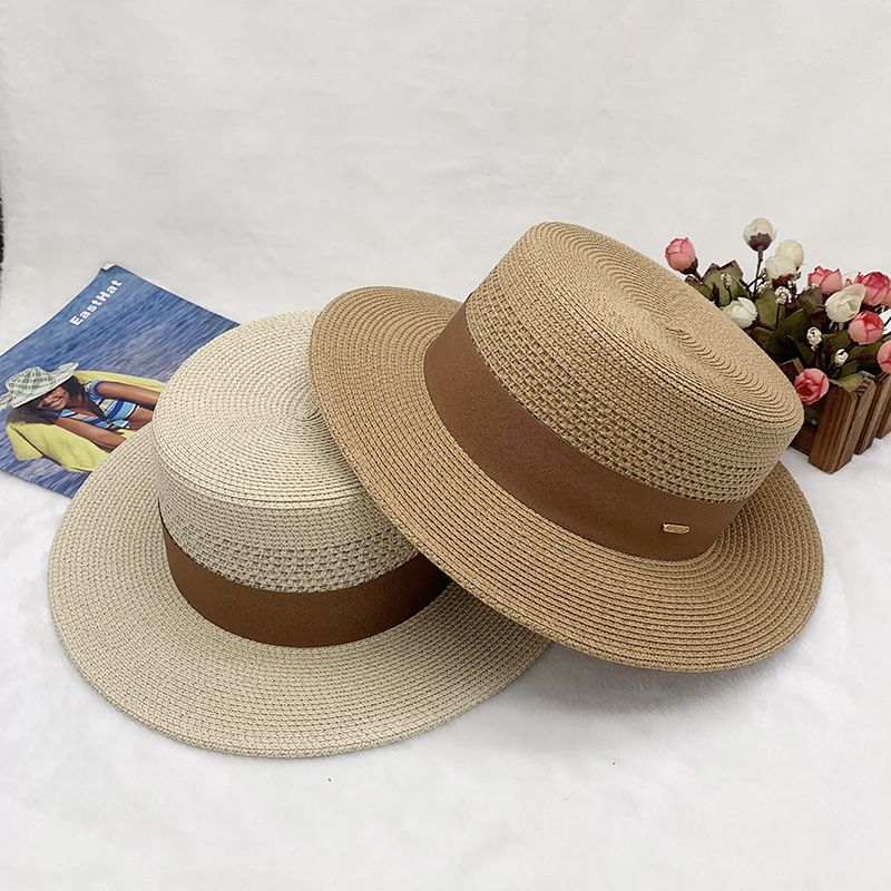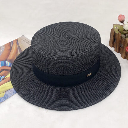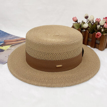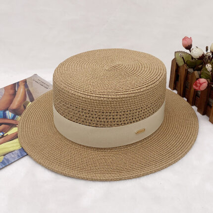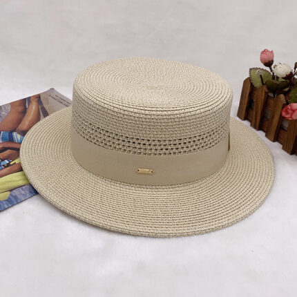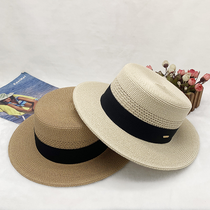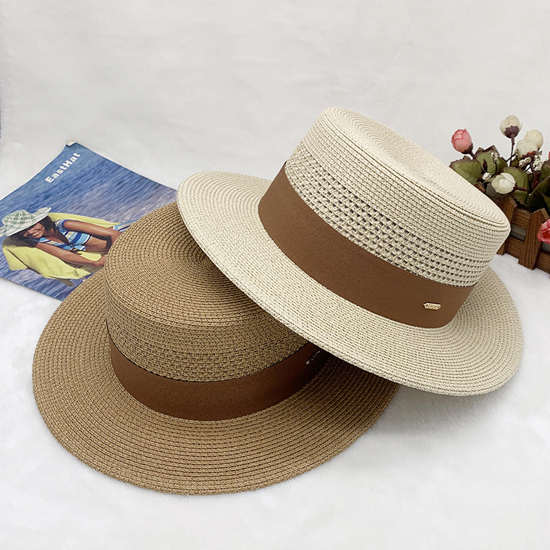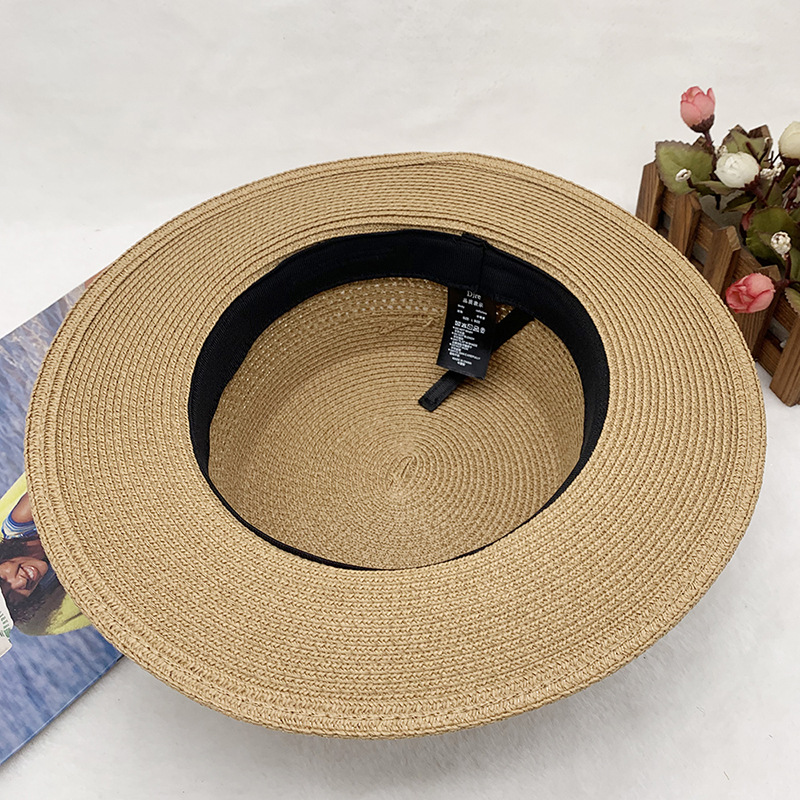 High-quality European and American best-selling straw hat for women, beach sun protection flat-top hat with hollow top, woven fabric, sun protection hat with wide brim, casual hat