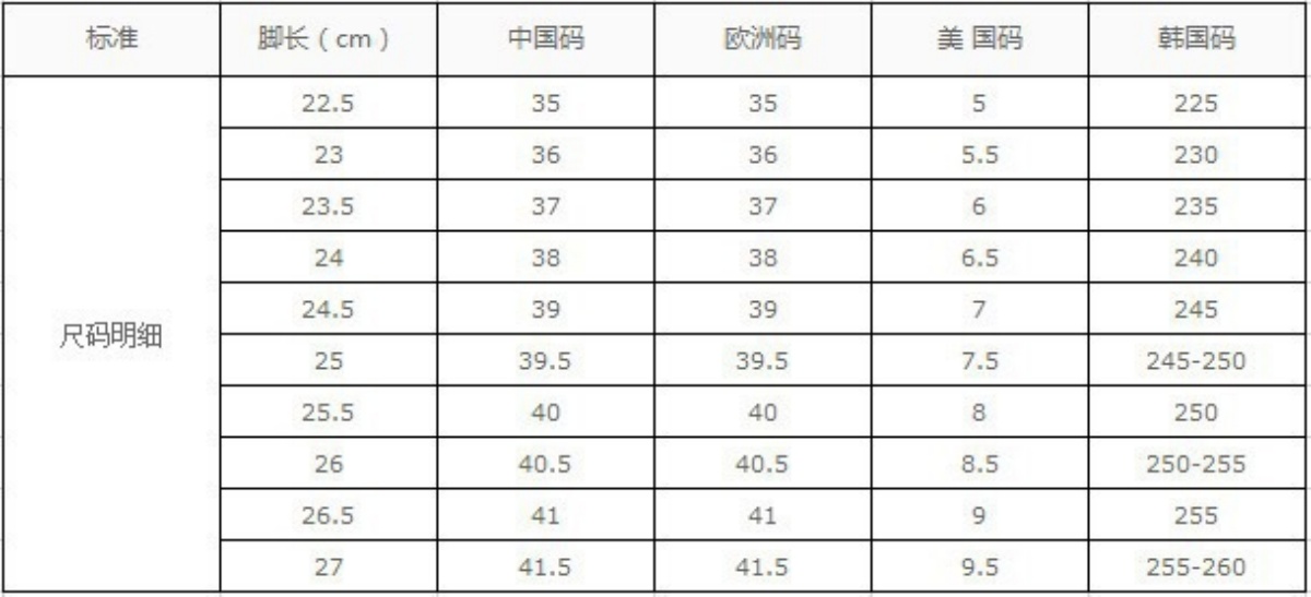 CN35(US5) ,CN36(US5.5) ,CN37(US6) ,CN38(US6.5) ,CN39(US7) ,CN40(US7.5) ,CN41(US8) ,CN42(US8.5) ,CN43(US9) |