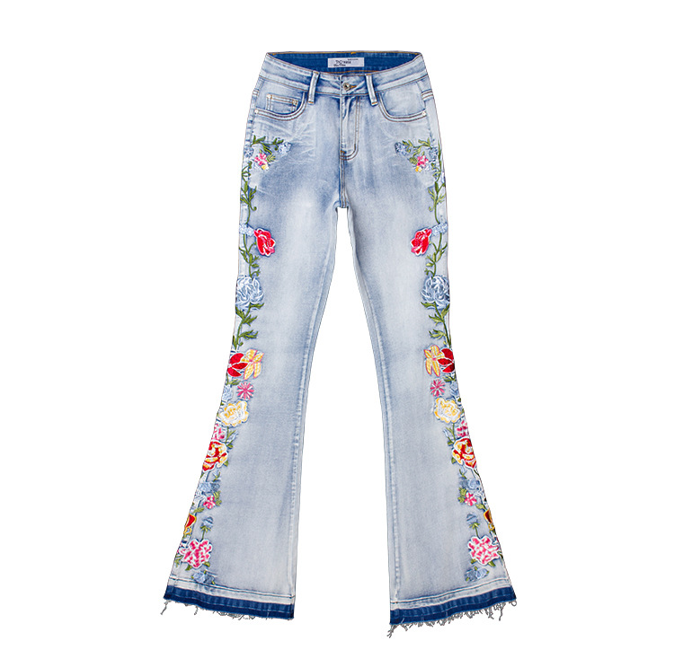 Yilu_High-quality heavy-duty 3D embroidered women’s denim long pants with flared legs