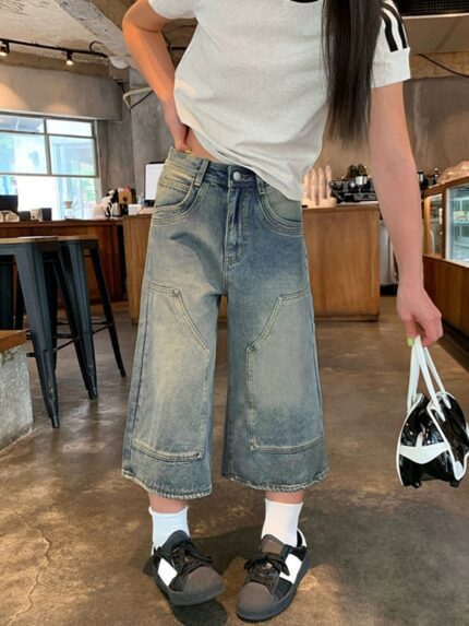 Yilu_High-quality European women’s multi-button denim short pants, loose and versatile, comfortable straight-legged five-packs