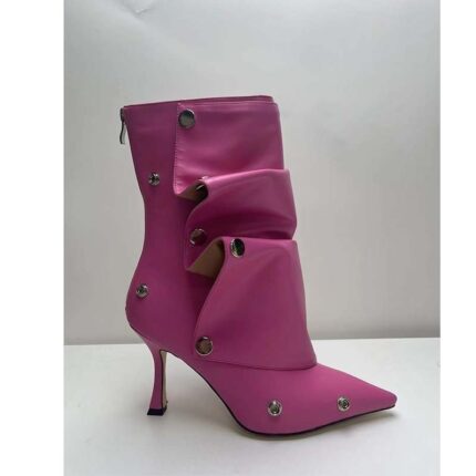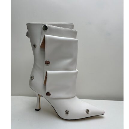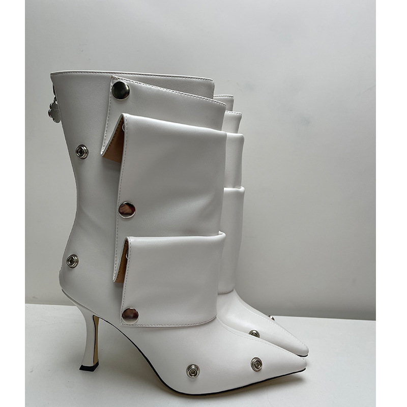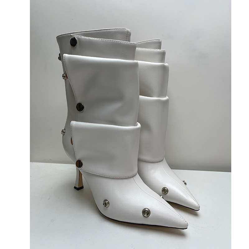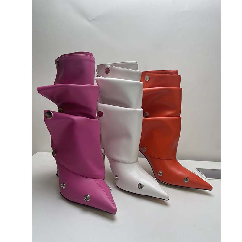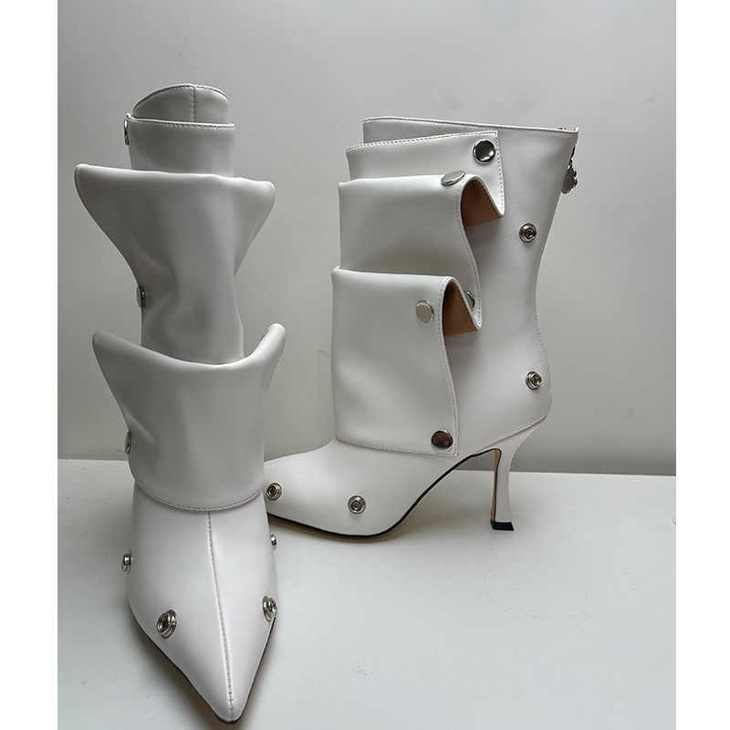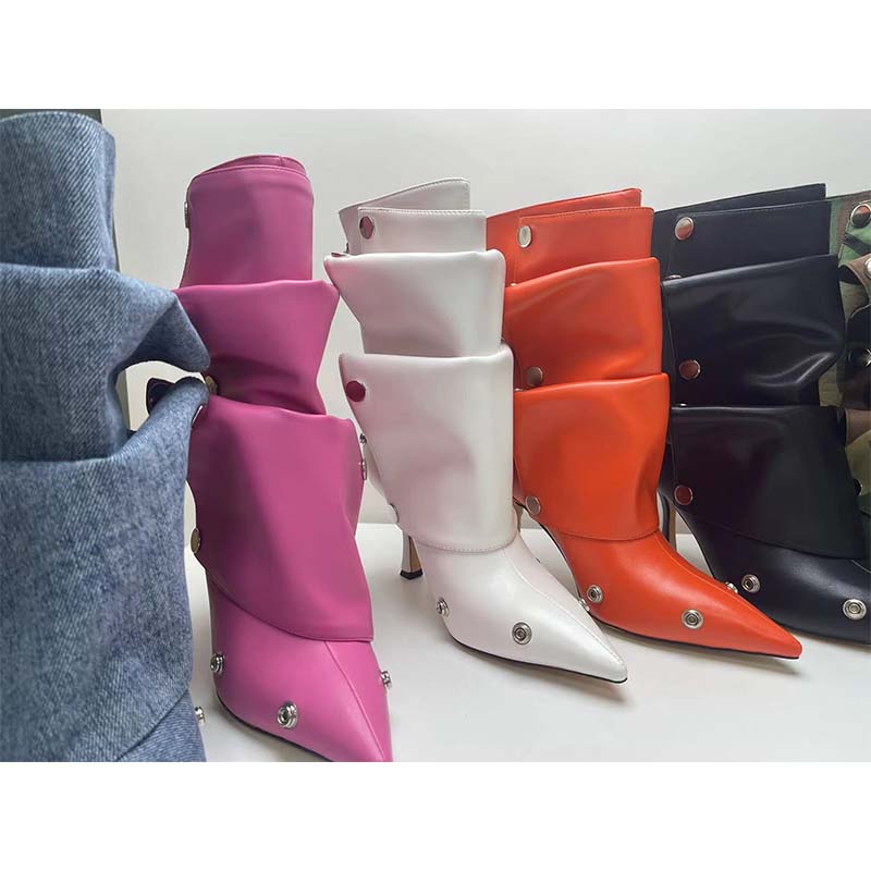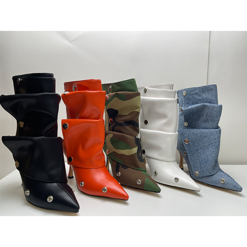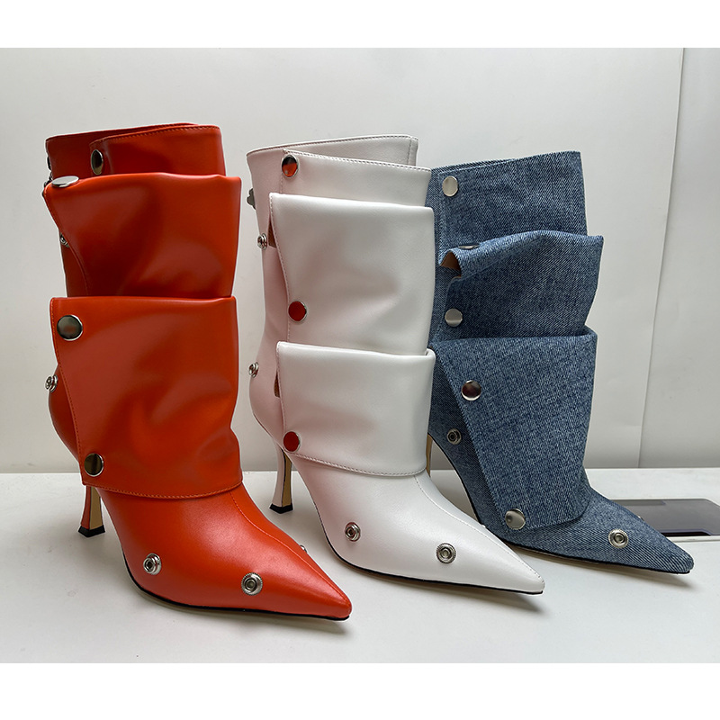 Yilu_High-quality high-heeled pointed-toe metal rivet denim patchwork two-way stacked oversized short boots