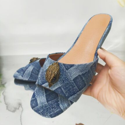Yilu_High-quality interlayer round-toe fish-mouth back-striped metallic color denim-patterned flat-bottom large-size women’s slippers