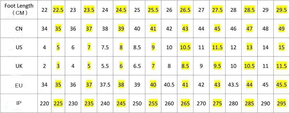 CN35(US5) ,CN36(US6) ,CN37(US7) ,CN38(US7.5) ,CN39(US8) ,CN40(US8.5) ,CN41(US9) ,CN42(US10) ,CN43(US10.5) ,CN44(US11) |