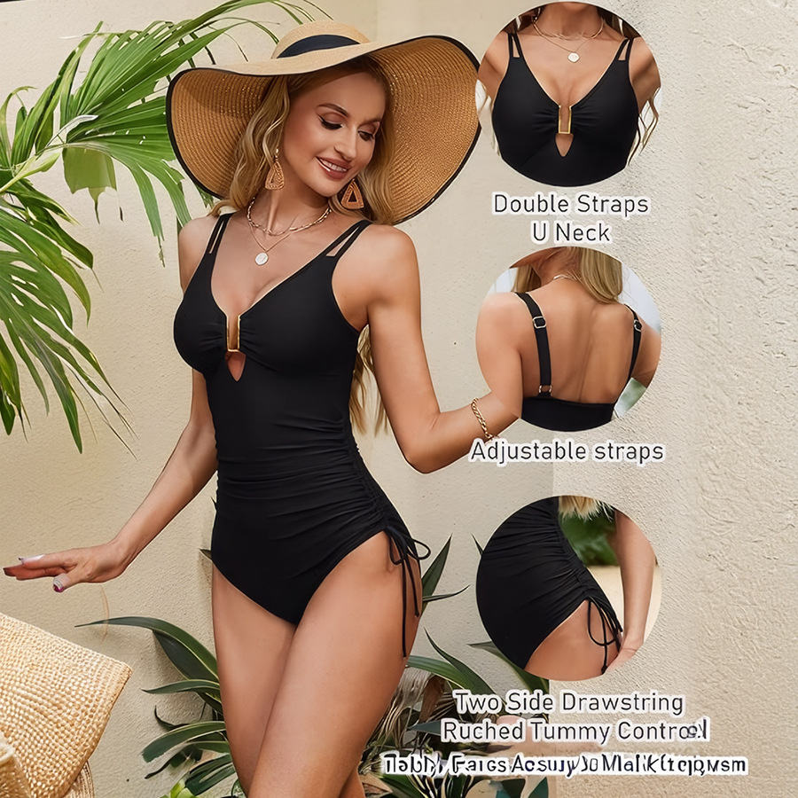 High-quality deep V-neck figure-hugging swimming suit with backless and drawstring design, one-piece women’s swimming suit