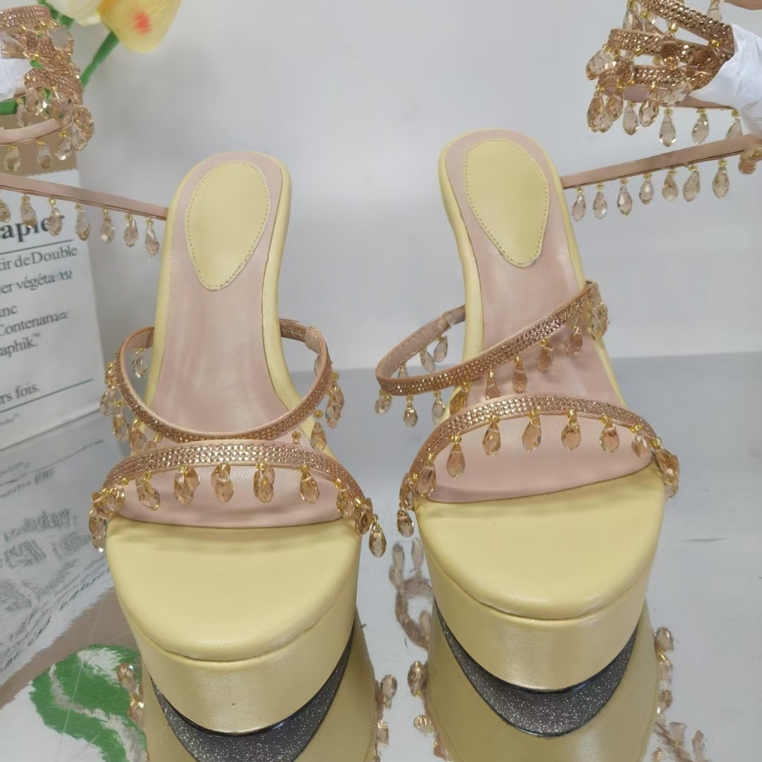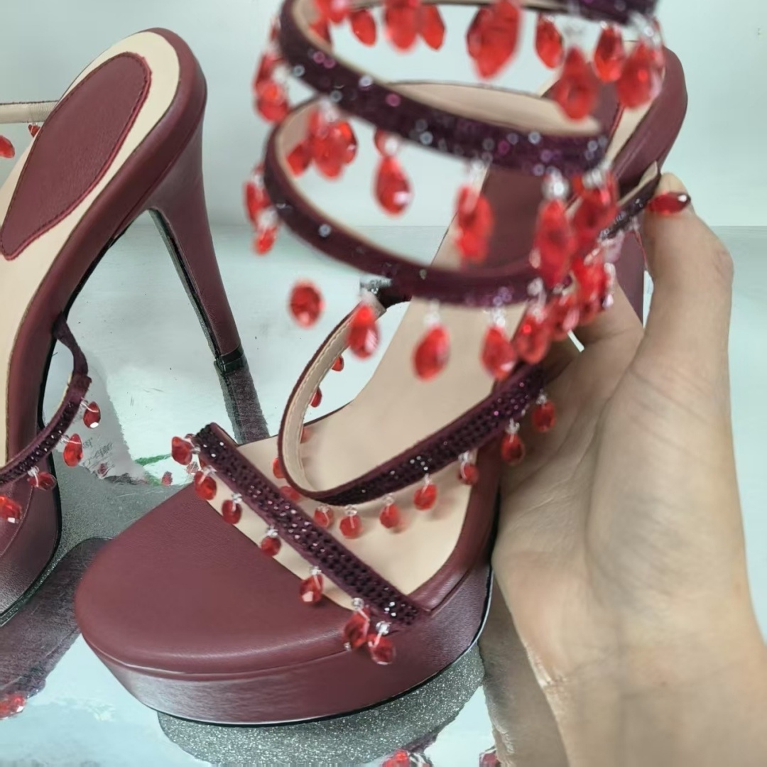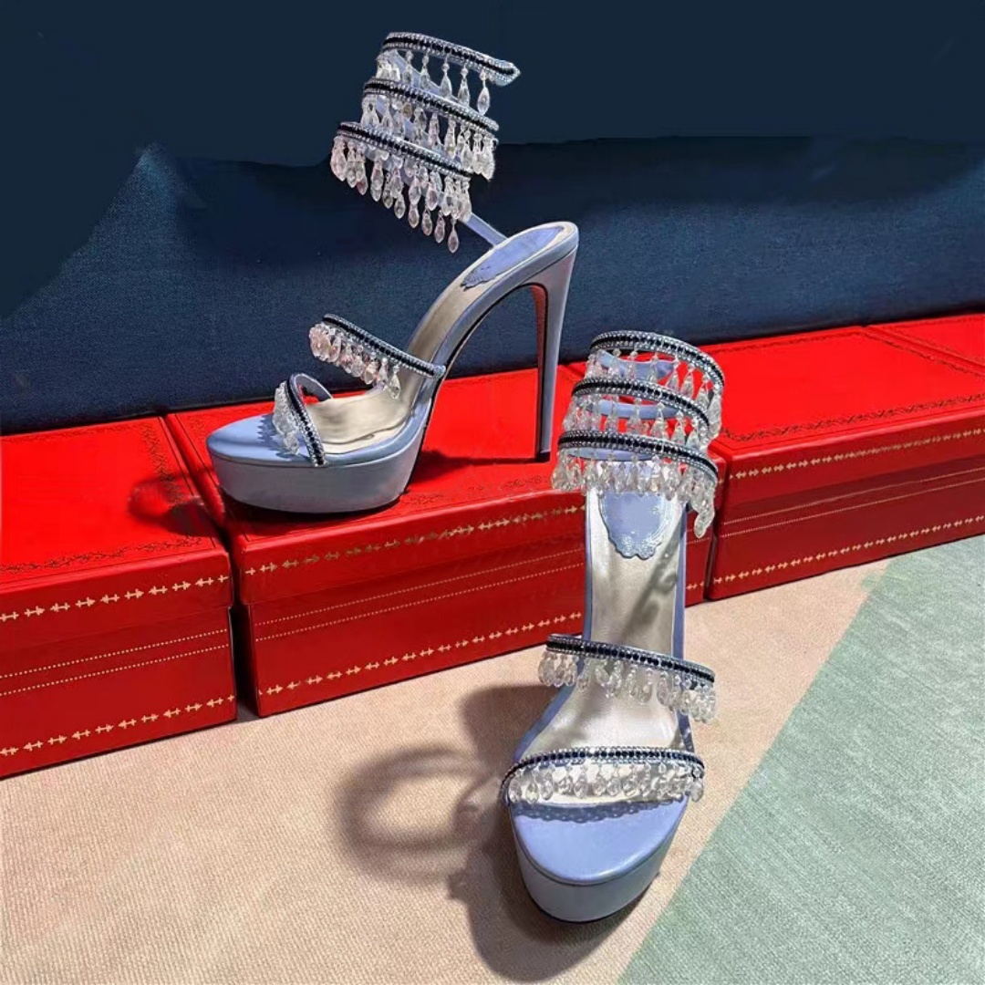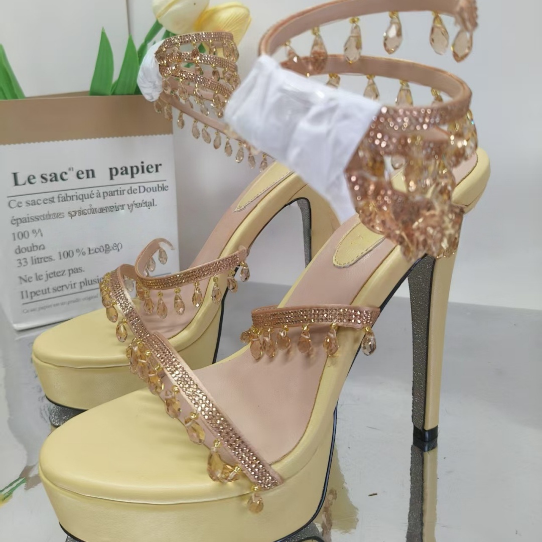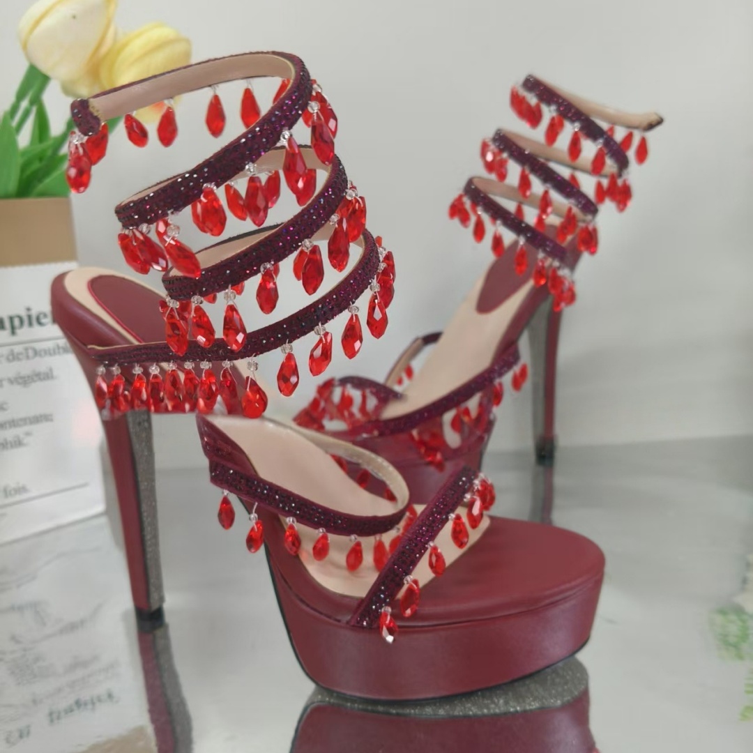 Yilu_High-quality round-toe high-heeled waterproof platform one-strap water-drop snake-shaped wrapped large-size beaded crystal thin heel sandals