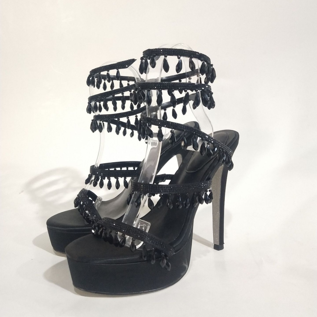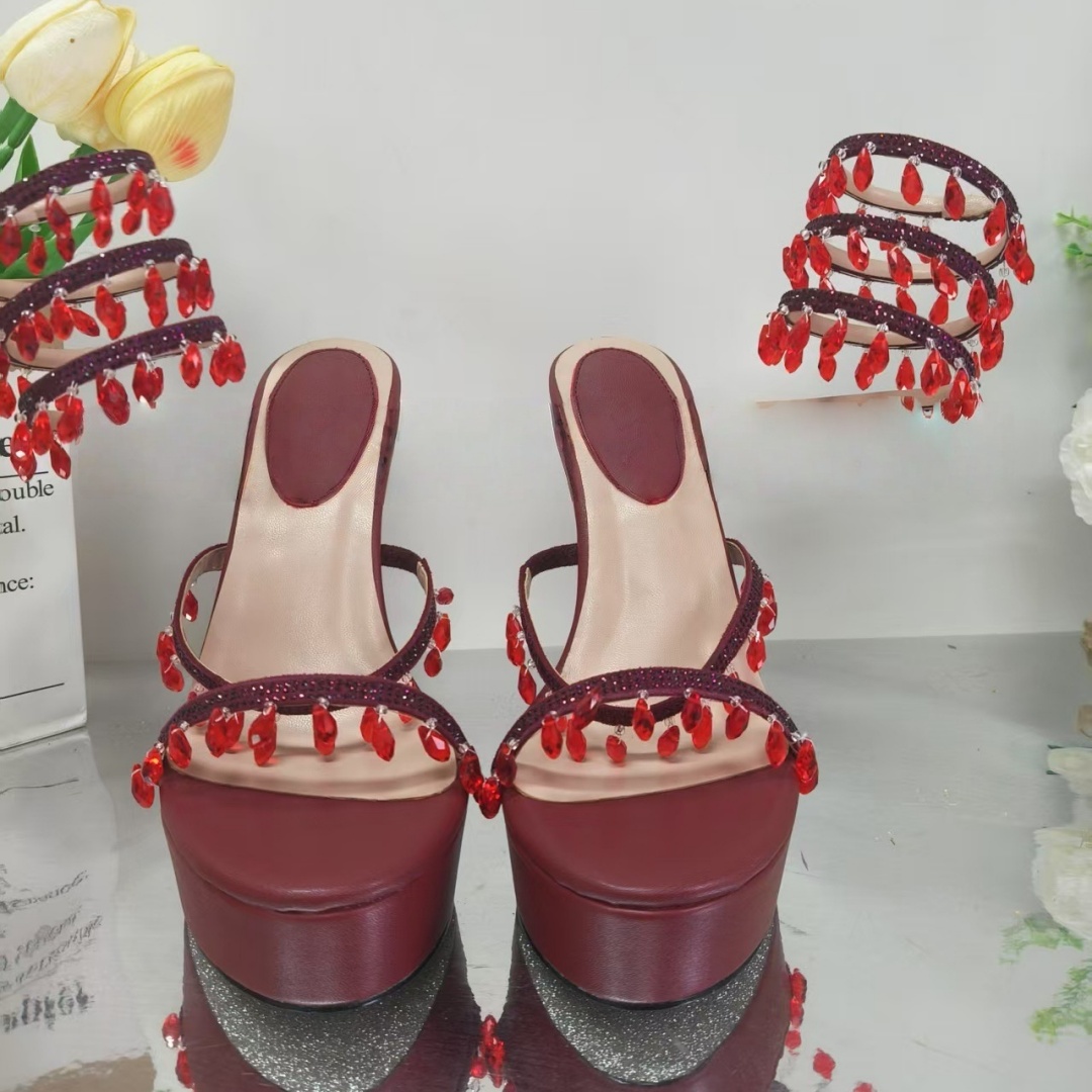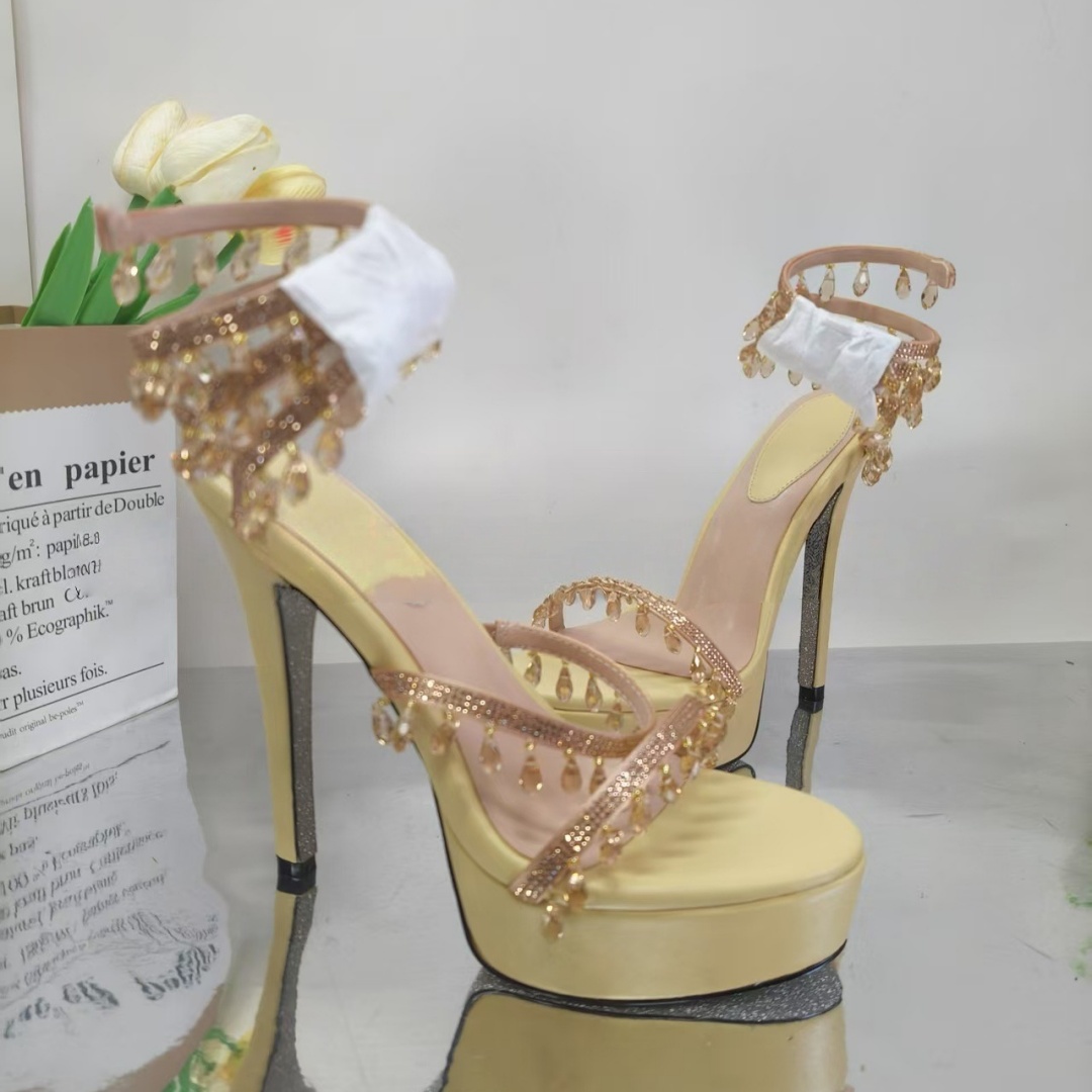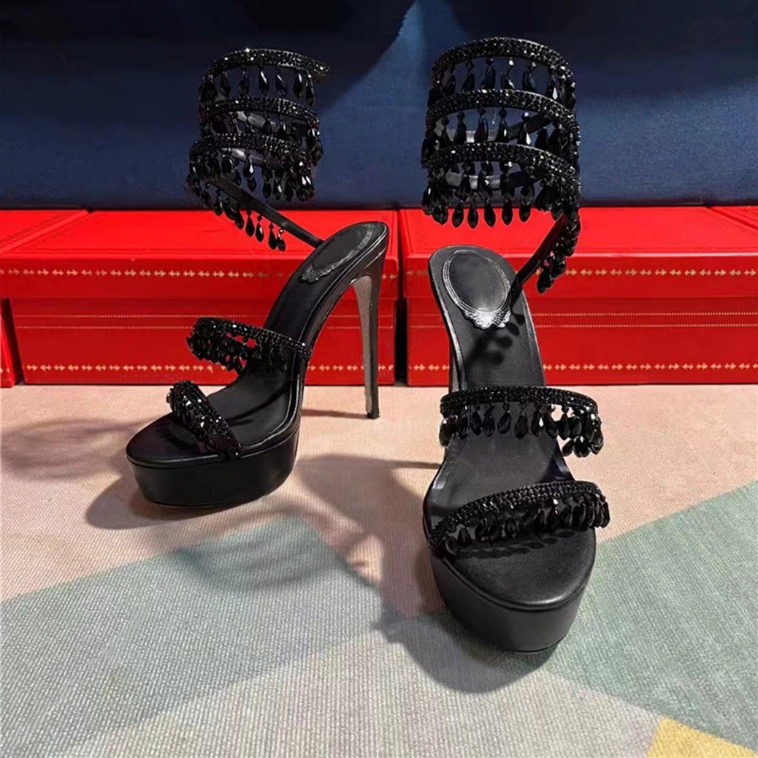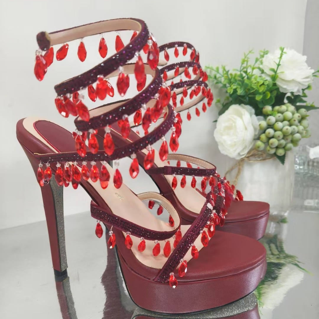 Yilu_High-quality round-toe high-heeled waterproof platform one-strap water-drop snake-shaped wrapped large-size beaded crystal thin heel sandals