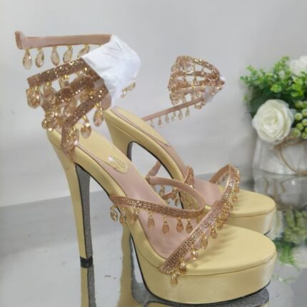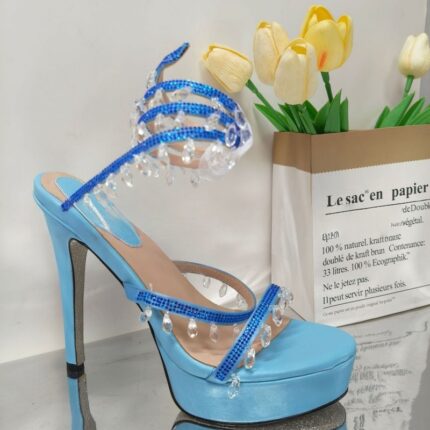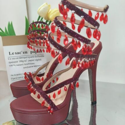 Yilu_High-quality round-toe high-heeled waterproof platform one-strap water-drop snake-shaped wrapped large-size beaded crystal thin heel sandals