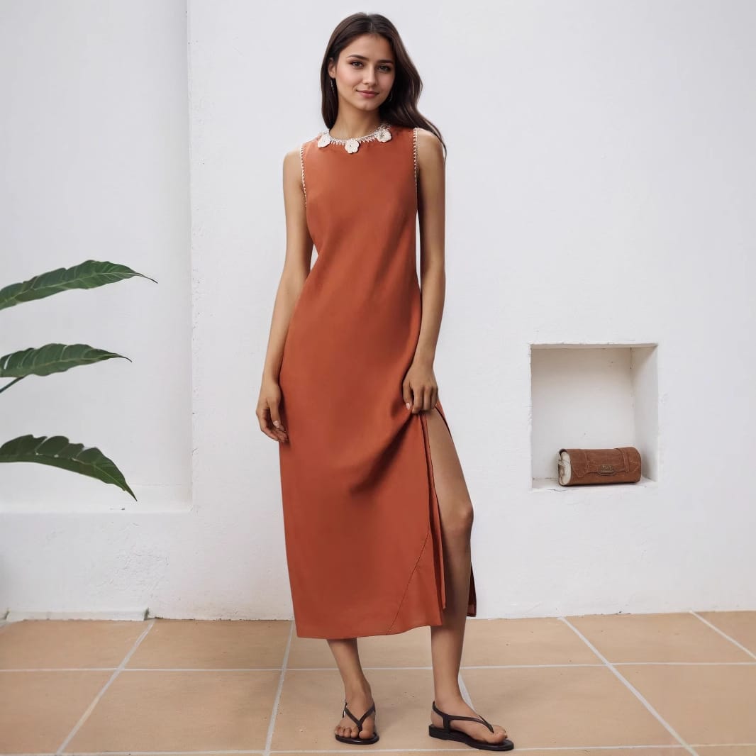Yilu_High-quality sleeveless slit dress with delicate floral pearl collar for ladies’ formal wear