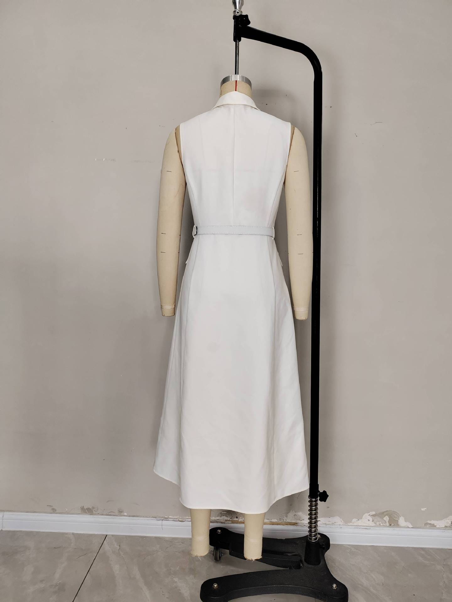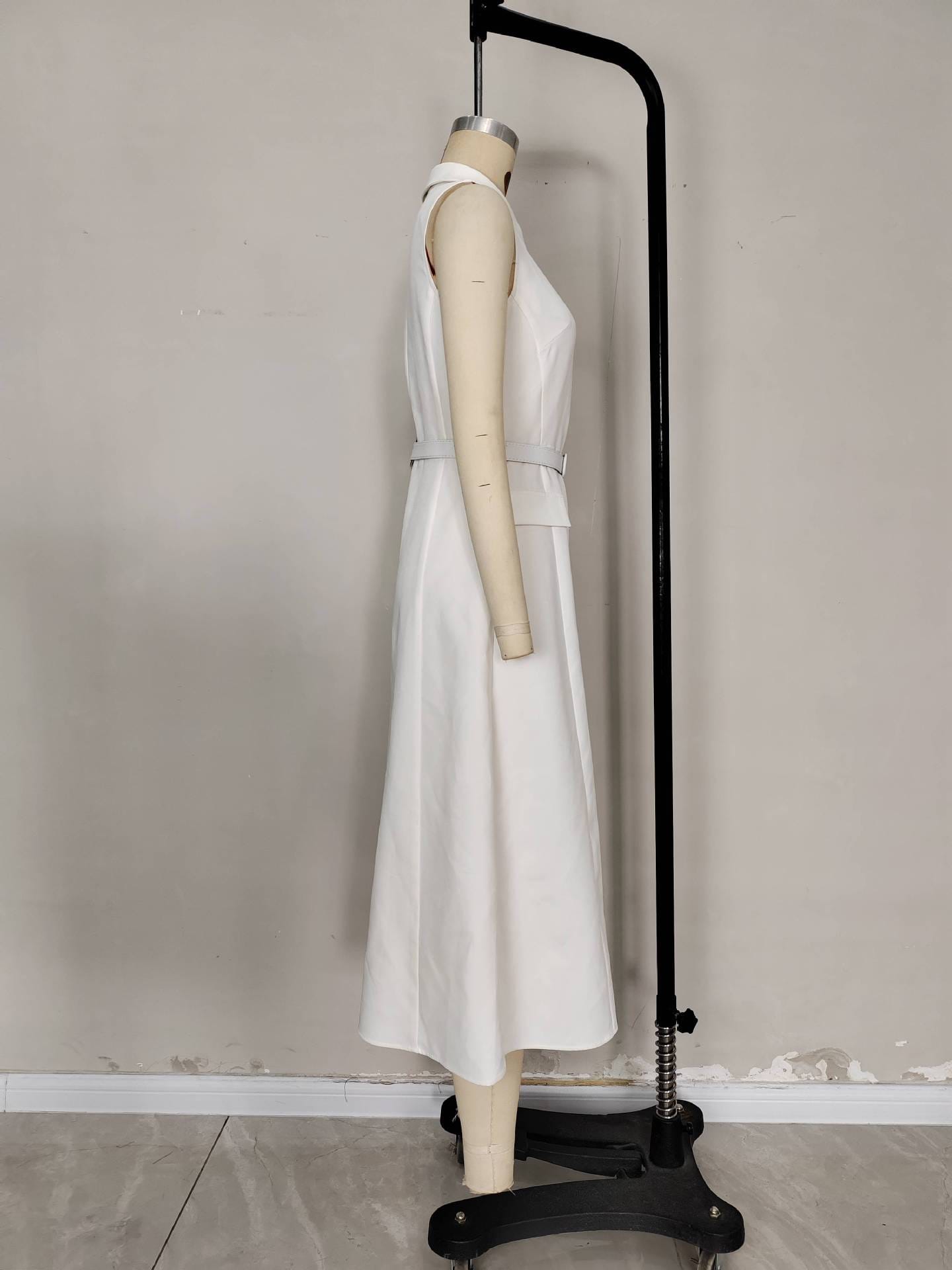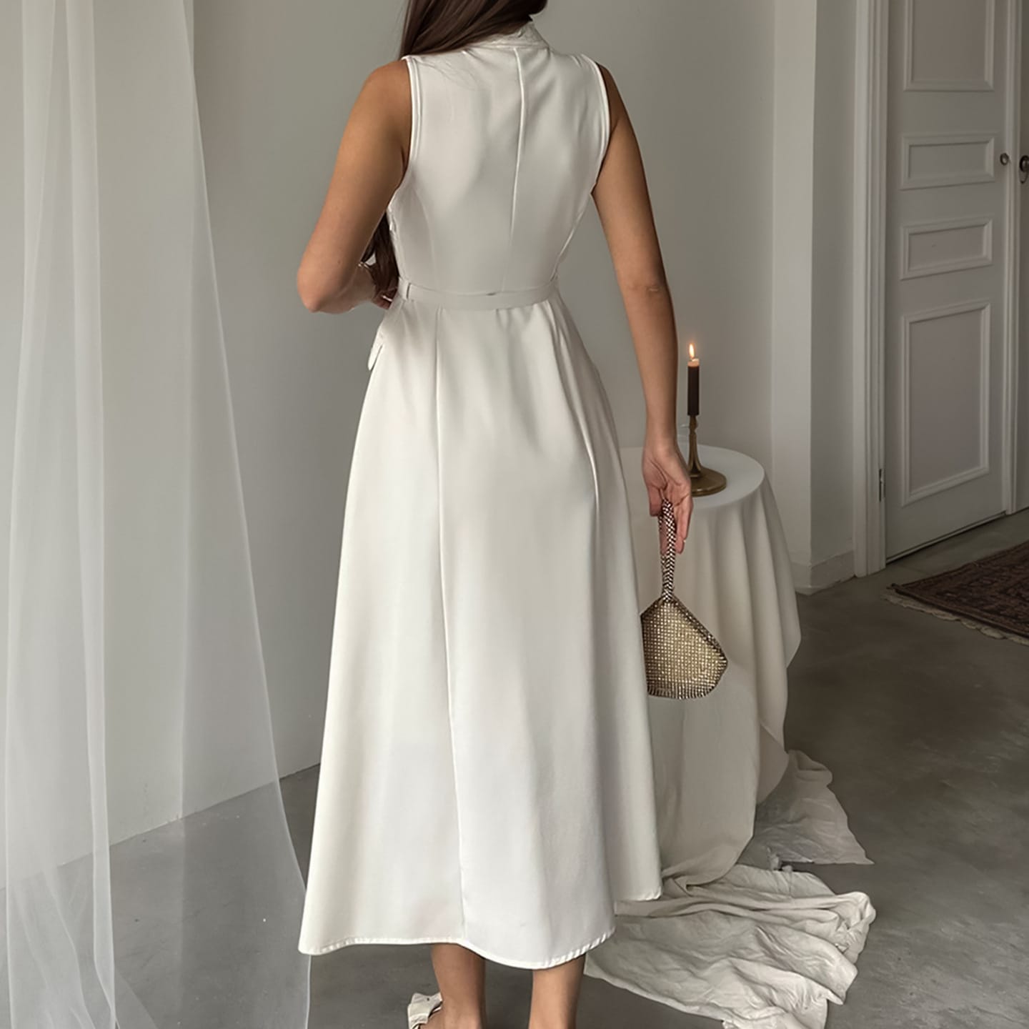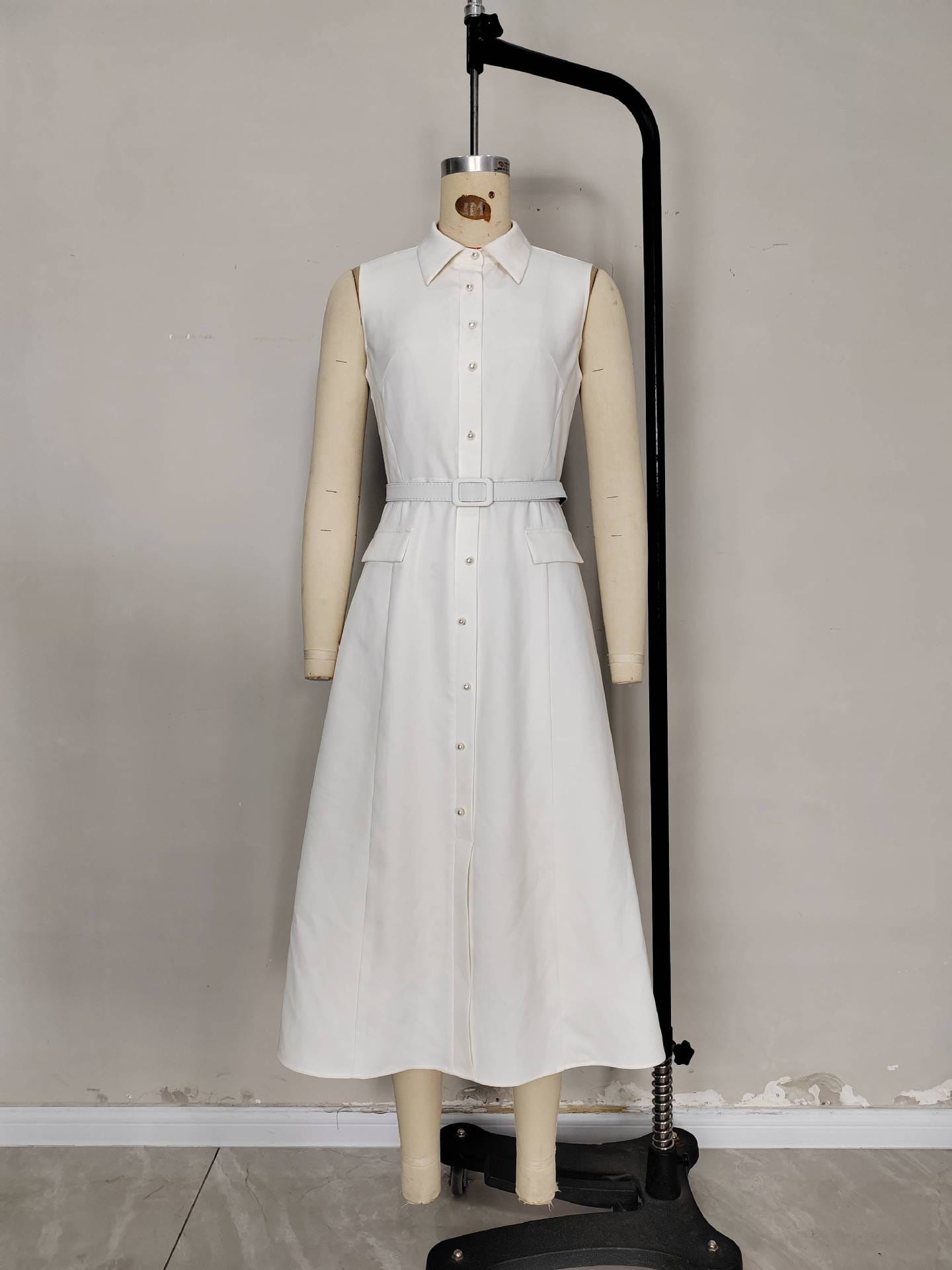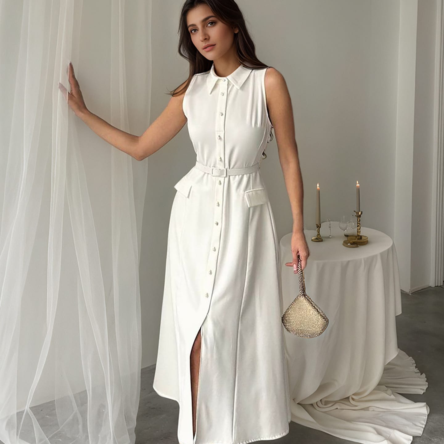 Yilu_High-quality solid-color sleeveless belt with pearl buttons, fitted and slit dress
