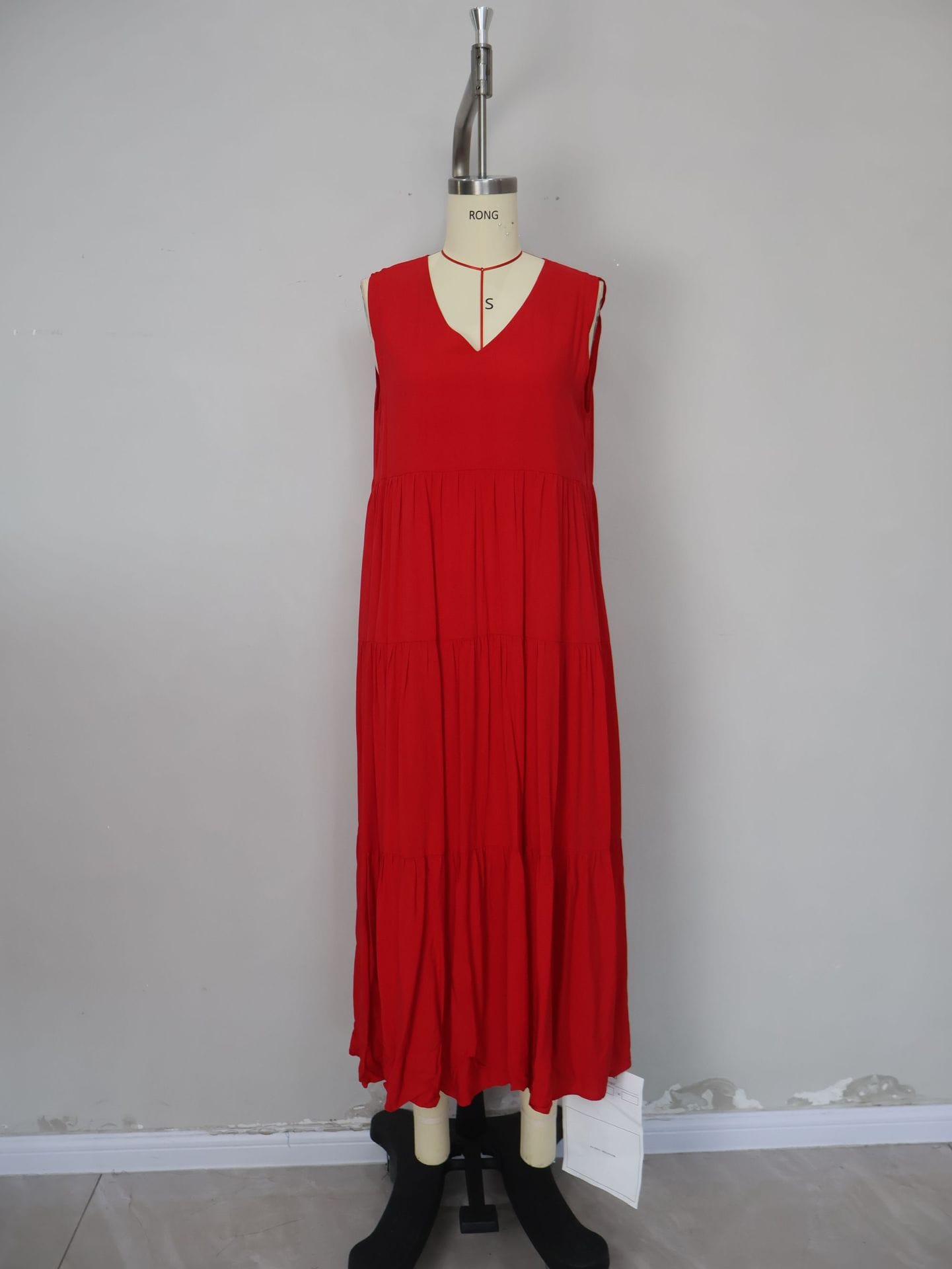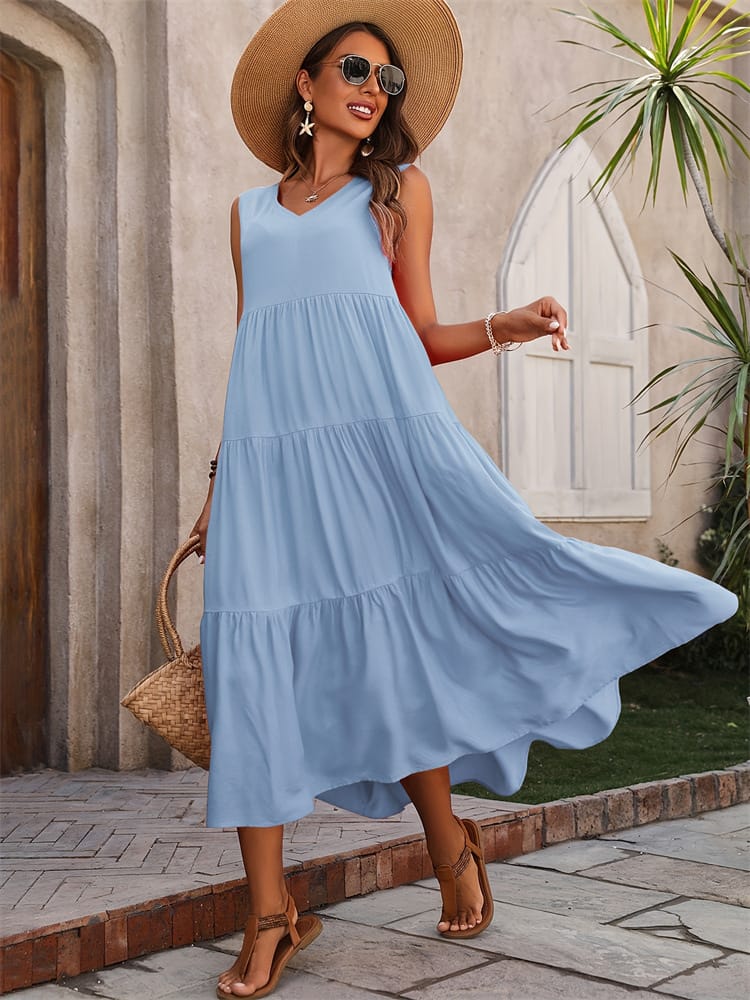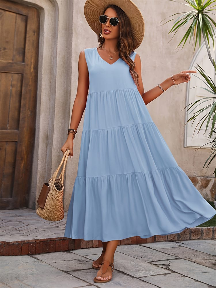 Yilu_High-quality solid-color V-neck layered and stitched skirt with a loose fit at the bottom