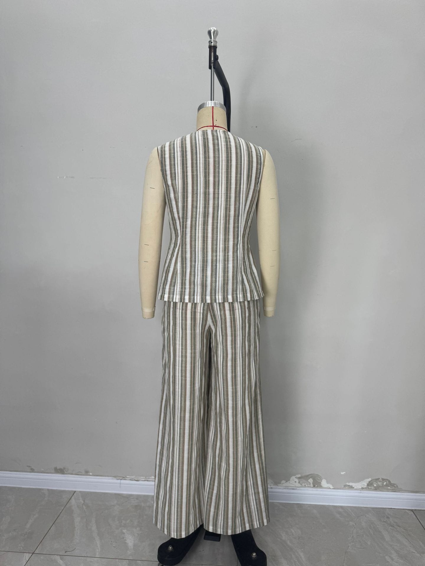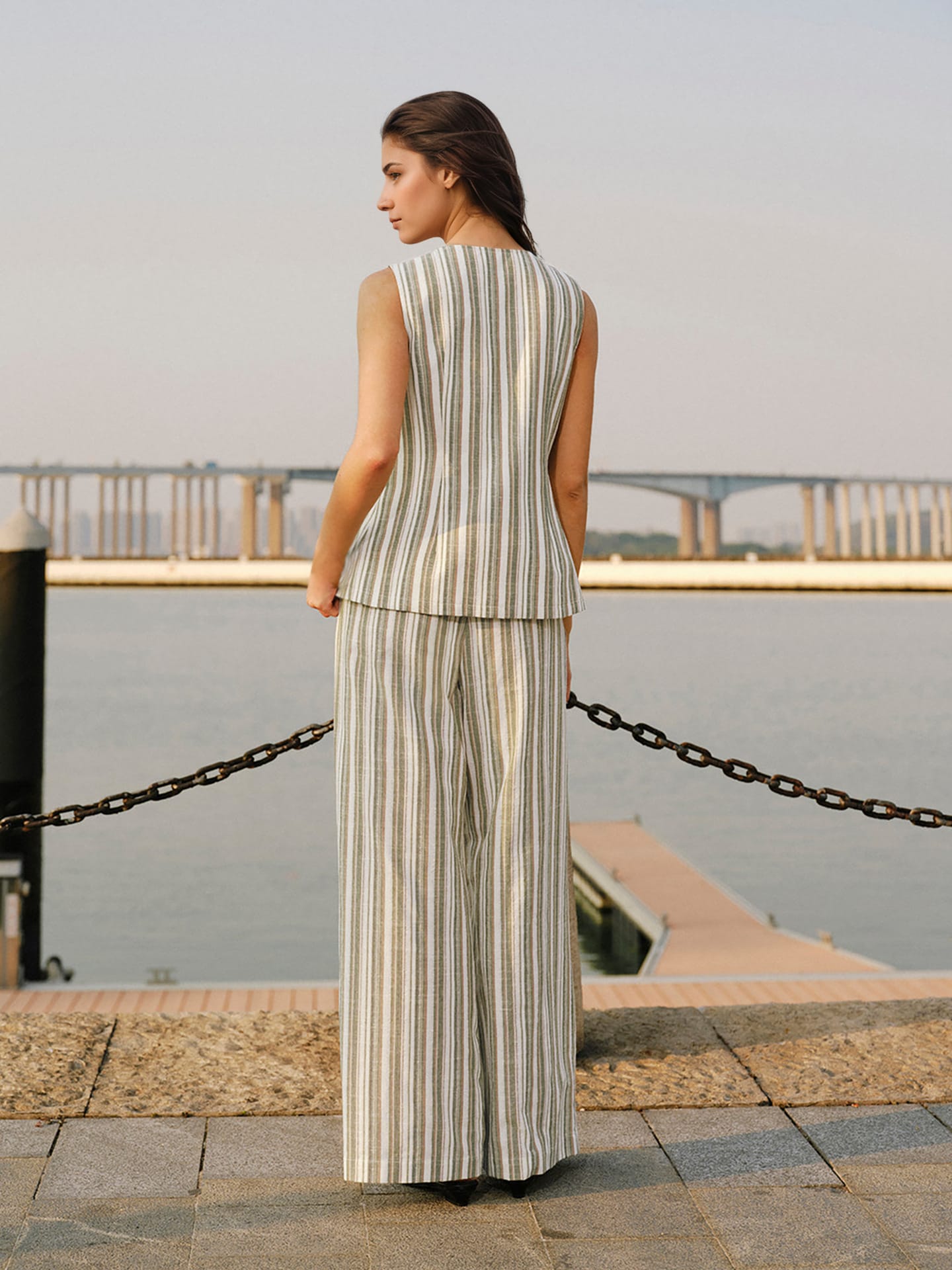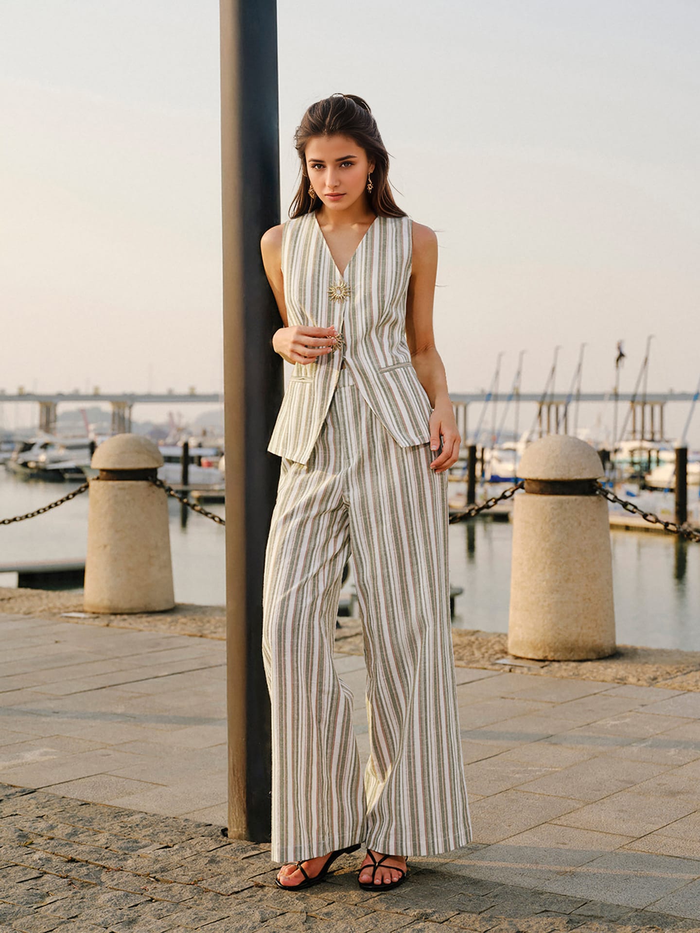 Yilu_High-quality striped sleeveless top and loose-fitting wide-leg pants set