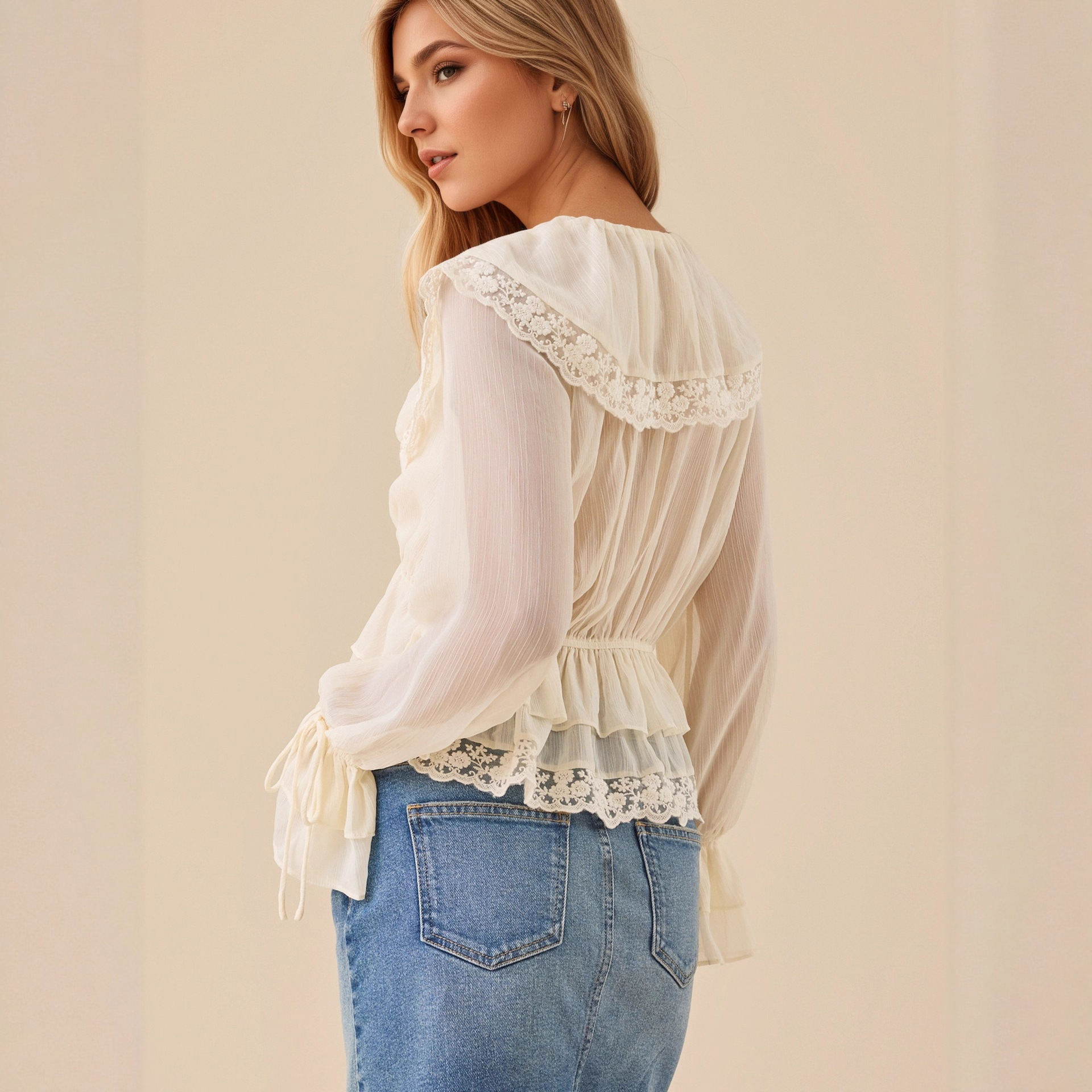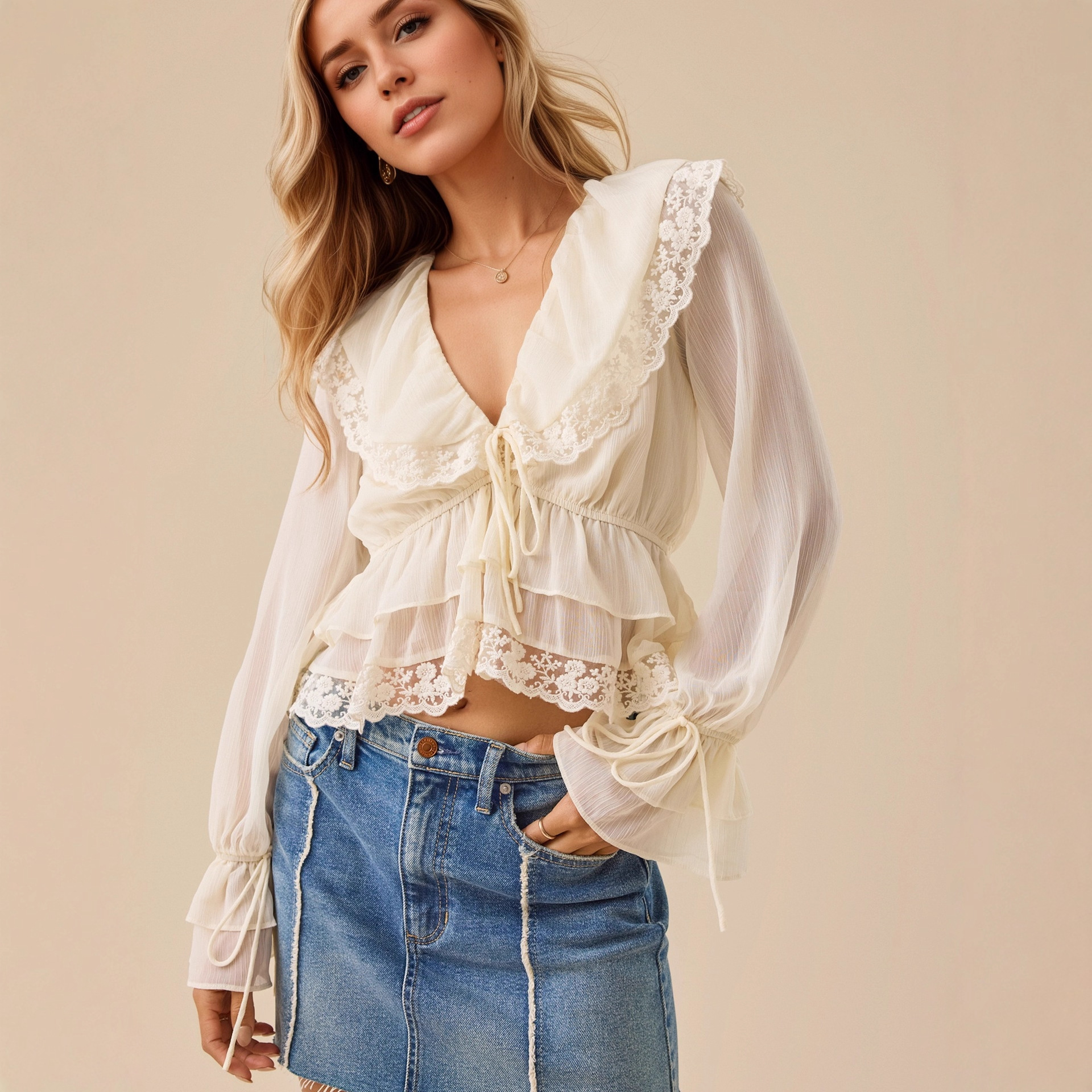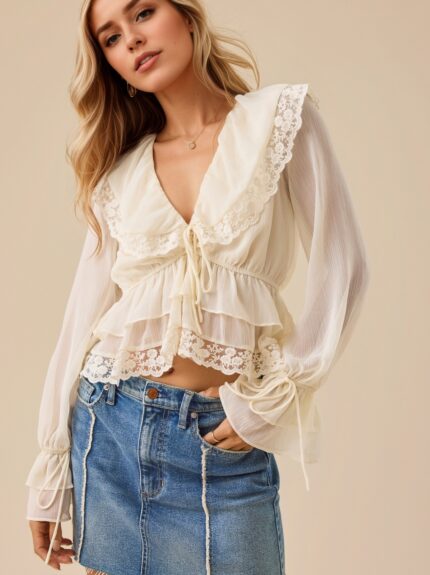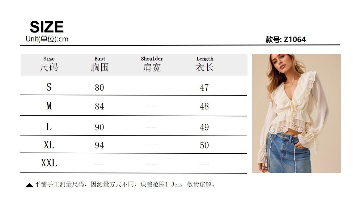 Yilu_High-quality V-neck lace-trimmed lace patchwork design – stylish and fashionable cross-border top with delicate V-neck and lace trim.