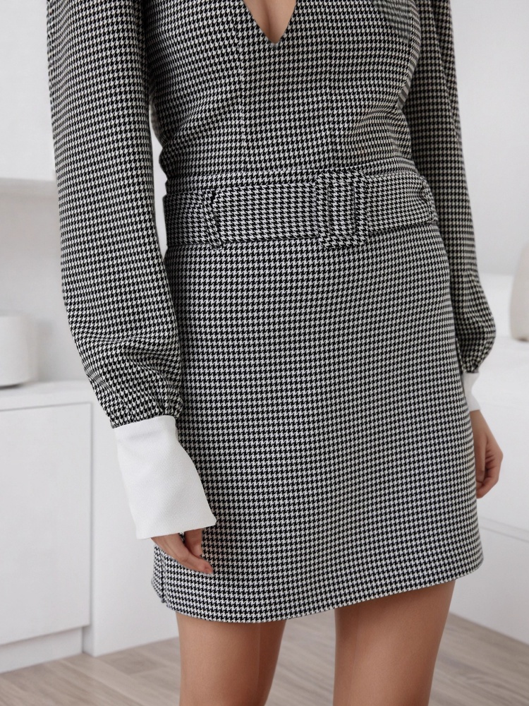 Yilu_High-quality peplum-style V-neck dress with belt for slimming effect, featuring a trendy short style suitable for European fashion, made of high-quality fabric.