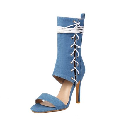 Yilu_High-quality high-heeled pointed-toe metal rivet denim patchwork two-way stacked oversized short boots