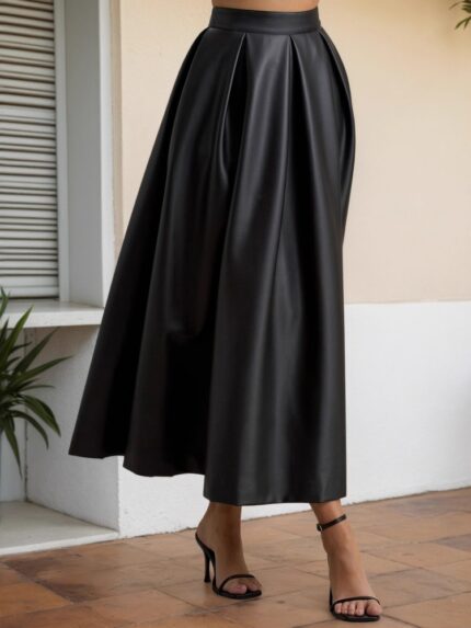 Yilu_High-quality women’s spring-autumn new high-waisted business casual umbrella skirt with PU leather design – versatile and easy to match – A-line half-length skirt